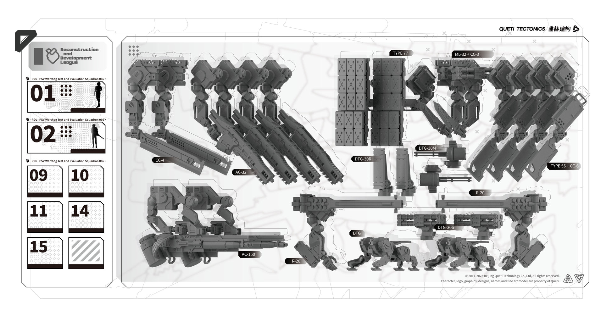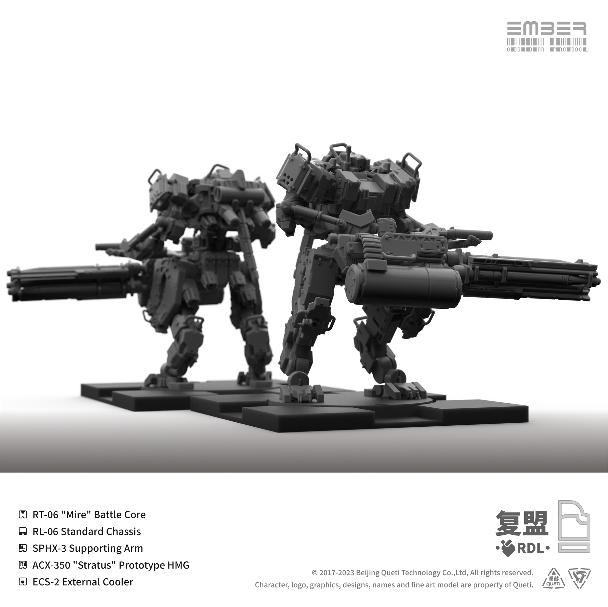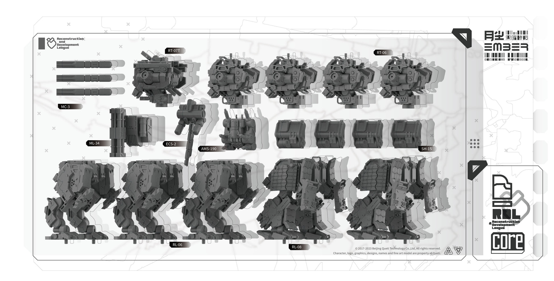 This RDL Core box combines 5 mechs, 2 Tactical Drones, and a large number of interchangeable modular parts, offering a wide selection of weapons from fully automatic gunnery stations to heavy machine guns, as well as an assortment of auxiliary backpacks and cores that can give your team a tactical advantage.