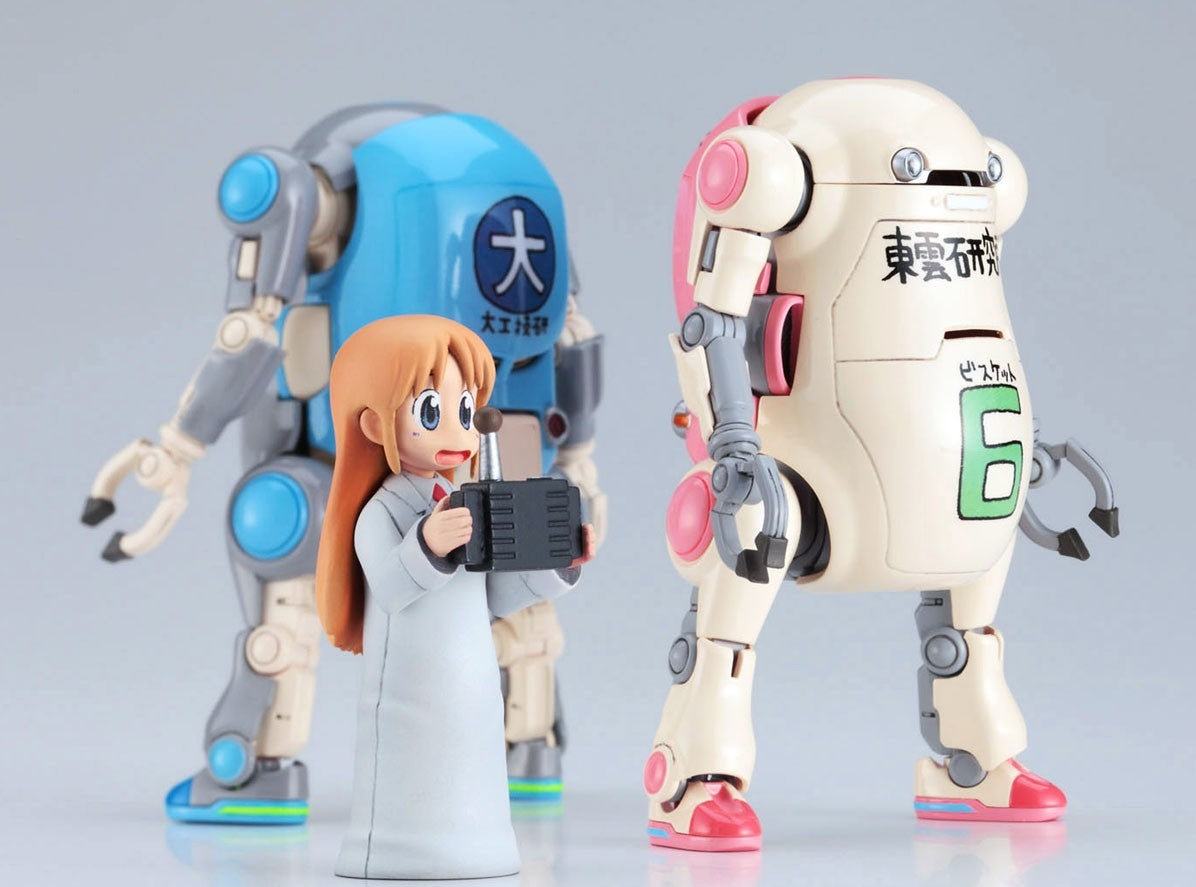 除了两个 Mechatro 套件外,该套件还包含 Hakase、Nono 和 Sakamoto 的 1/35 比例塑料人偶! (叶加濑和诺诺可以登上 MecatroWeGos)。还包括荒维敬一绘制的贴花来装饰你的机甲!