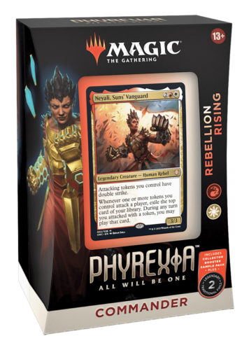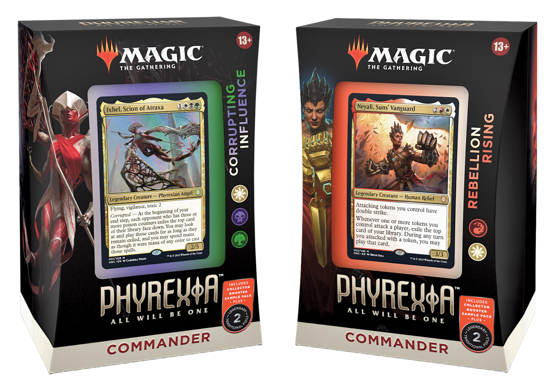 这 非瑞克西亚:一切皆为一 指挥官牌组套装包括 1 副即用型 100 张魔法牌(2 张传统箔传奇牌、98 张非箔牌)、2 张收藏补充包样本包、1 张蚀刻箔展示指挥官(指挥官的厚卡片纸副本)卡片边框和图案上刻有箔纸)、10 个双面代币、1 个牌盒(可容纳 100 张套卡)、1 个生命轮、1 个策略插入物和 1 个参考卡。