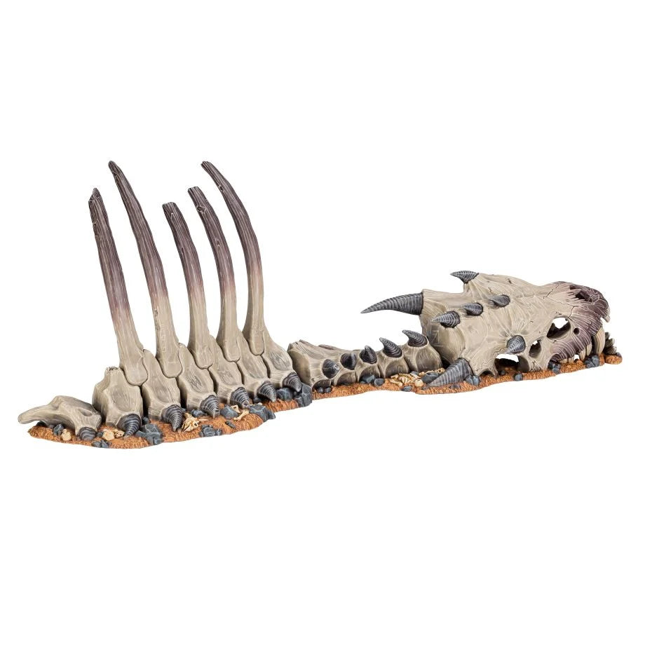 这款多部分塑料套件可构建一套 Megadroth 遗迹,这是一个以古尔荒野为主题的宏伟地形作品。这个巨大的骨架在任何战场上都很适合,并且可以组装成三个独立的部分 - 胸腔、头骨和下颌 - 让你可以按照你认为合适的方式排列倒下的怪物,打开或关闭下颌。它可以与 Realmscape 地形范围的其余部分结合起来,建造您自己的古尔什前哨站,供军队和战队争夺。