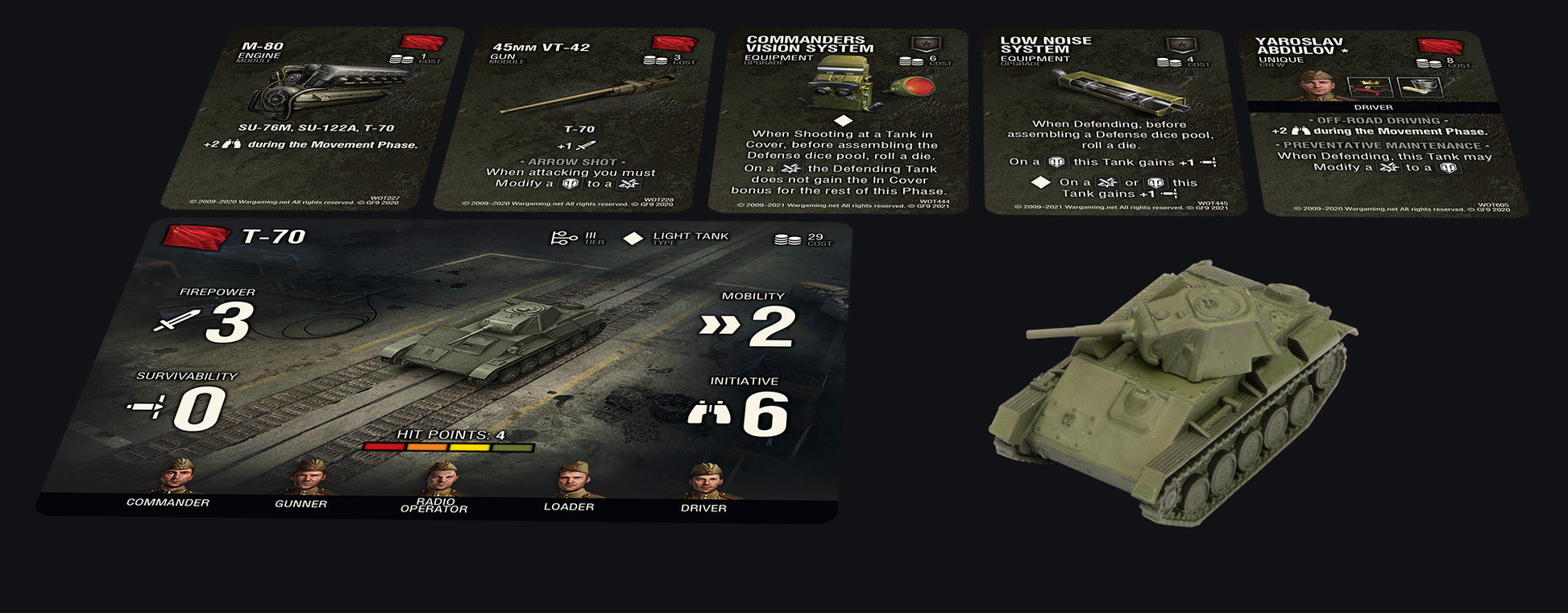 T-70内部 扩展包,您会发现一个非常详细的、组装好的、预先涂底漆的塑料T-70 坦克微型和坦克卡。您的坦克可以使用随附的五个乘员卡、模块卡和升级卡进一步个性化以满足您的要求。