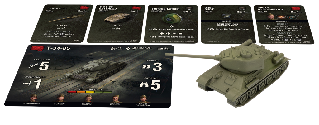 俄罗斯 T-34-85是一款出色的全能中型坦克,具有可靠的属性和机动性 3,使其成为与其他坦克战斗的理想选择。作为中型坦克意味着它可以重新投掷空白攻击骰子以确保持续的伤害。保留基础 Firepower 5 或将其与 122毫米T-11 给T-34-85的枪 高爆,这款标志性坦克是桌面上不可忽视的力量。